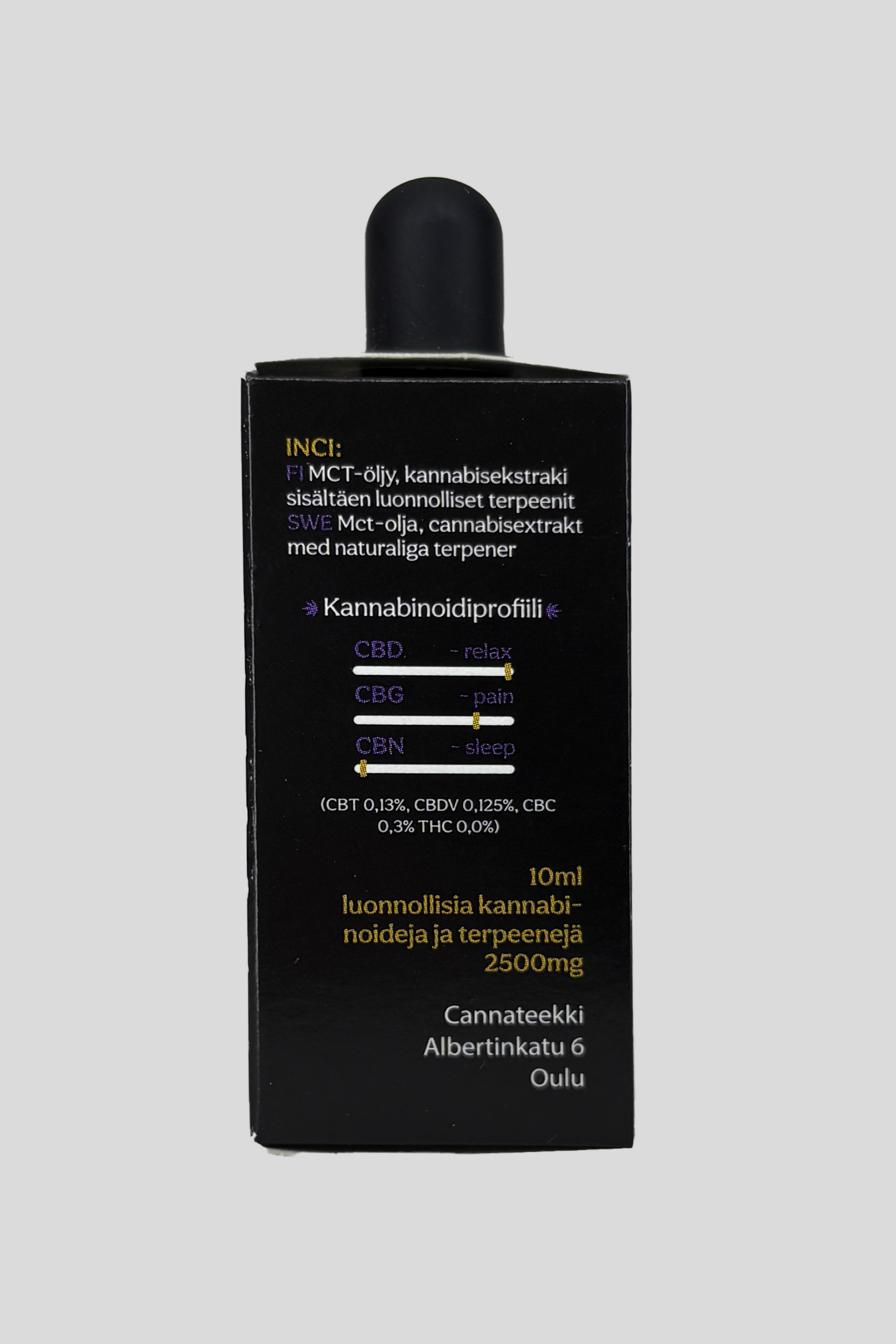 Cannateekin yksinoikeudella myytävät laajan spektrin ”single strain” -öljyt uutetaan aina yhdestä tarkoin valikoidusta kannabislajikkeesta. Näin öljyssä on kaikki kasvin kannabinoidit ja terpeenit, täydellisessä luonnollisessa synergistisessä suhteessa ilman laimentamista tai pitoisuuksien keinotekoista kasvattamista isolaateilla. Kokeile, ja huomaat eron.